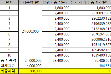 매달 20만원씩 증여한다고 생각하고 10년이면 2400만원을 일시금으로 증여하면 미성년자 증여 공제 금액 2000만원을 제외하고 초과 금액 400만원에 대해 최종세액은 388,000원이 발생합니다.