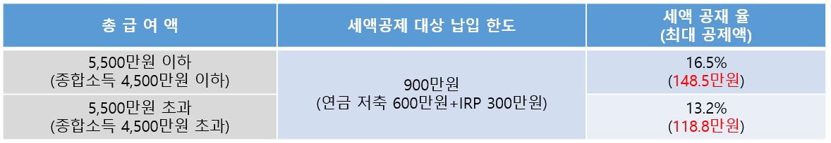 연금저축 계좌는 600만원까지 세액 공제가 되며 IRP 계좌는 900만원까지 가능하지만 연금저축이 없을 경우이고 연금저축에 600만원 투자 중이라면 300만원 세액 공제 혜택을 받을 수 있습니다. 소득에 따라 세액공제율이 총급여 5,500만 원 이하(종합소득 4,500만원 이하)는 16.5%이며 총급여 5,500만원을 초과(종합소득 4,500만원 초과)하면 13.2%의 세액 공제가 됩니다.