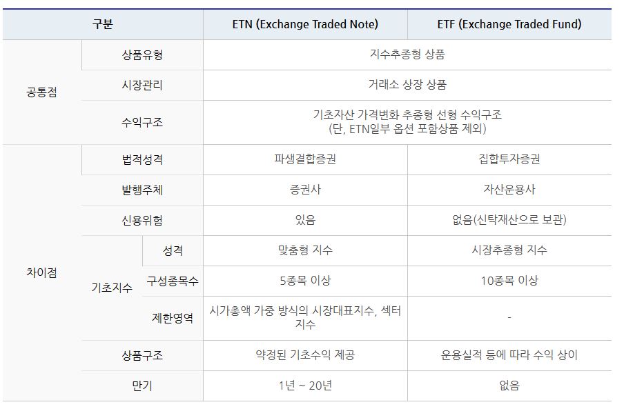 - ETN - 운용 방식에 제약이 적어 다양한 기초자산에 투자할 수 있는 상품을 신속하게 공급할 수 있는 장점이 있습니다.
